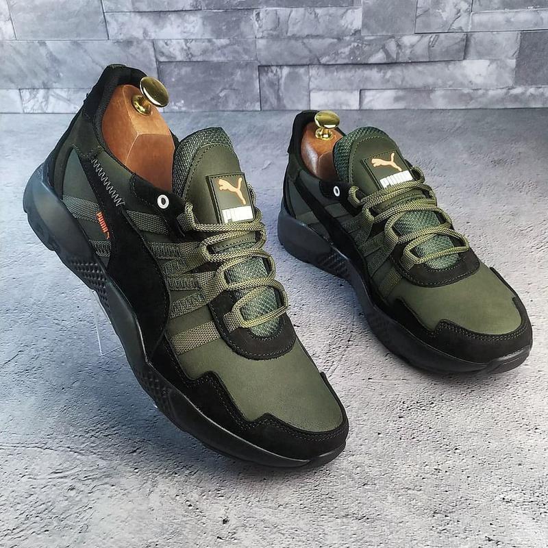 Кожаные мужские кроссовки Puma Код: Д58 Сезон: осень/весна Цвет: черный/хаки Верх: 100% натуральная кожа Внутри: обувной текстиль Подошва: термополиуретан Стелька: мягкая, съёмная, текстиль Качество супер Размеры : 40=26,5см; 41=27,4см; 42=28,1см; 43=28,7см; 44=29,5см; 45=30,2см;