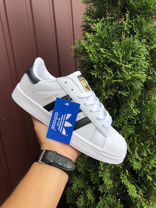 арт. 10675 Adidas Superstar , білі з чорним йдуть в лакованій коробці виробник: Вєтнам сезон: демісезонні розміри: 36 37 38 39 40 41 розмірна сітка:37-237см, 38-242см, 39-249см матеріал: прес шкіра, підошва резина, прошиті