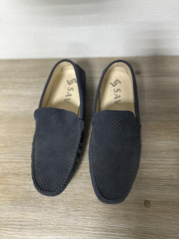 Замшеві темно-сині лофери. Спереді перфорація. Повністю шкіряні. Суцільна шкіра всередині ( показано на фото ). Ортопедична устілка. Усилений носок та п’ята. 43 розмір. Устілка - 28.7 см. Ціна собівартості. Розпродаж чоловічого відділу в стаціонарному магазині.