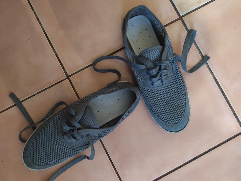 Чоловічі мокасини на літо або весну. Спереду сітка цупкіша, подвоєна. Мабуть краще підійдуть на нешироку, з середнім підйомом ногу. ' нюанси на двох останніх фото: брудна та трохи стерта підошва та місцями тканина прилягає не щільно до підошви. Заміри на фото.