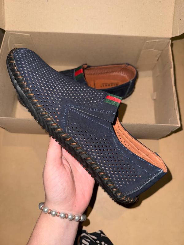👞 Стильные мужские летние мокасины MISHEL ▪️ Цвет: темно-синий ▪️ Материал: кожа с перфорацией (хорошо пропускает воздух) ▪️ Внутри: мягкая стелька для комфорта ▪️ Легкая и гибкая подошва ▪️ Удобная модель без шнуровки – быстро обуваются ▪️ Декоративная вставка с зелеными и красными полосками Идеально подходят для лета – дышащие, легкие и стильные. Гармонично смотрятся как с джинсами, так и с летними брюками или шортами. Размеры в наавности:39,45. 30/1