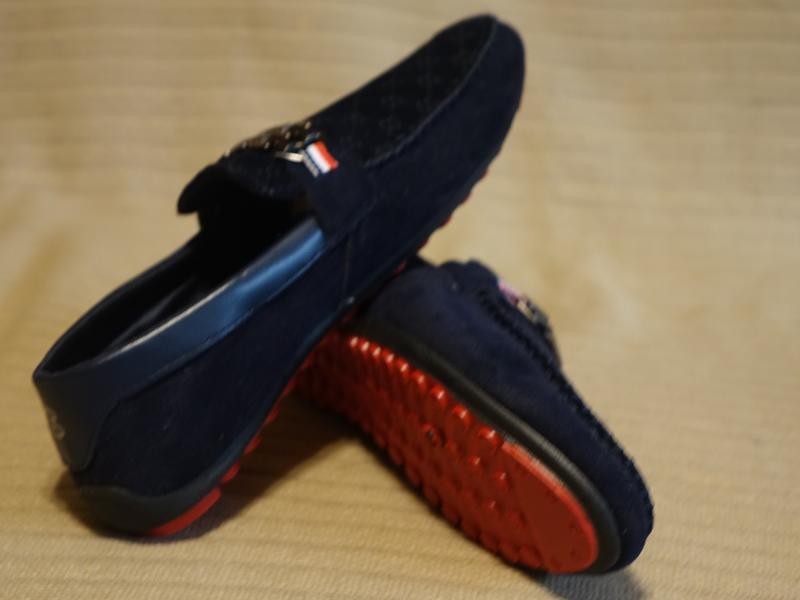 Продаются изящные темно-синие веганские мокасины. Верх изделия выполнен из комбинированных материалов. Основная часть - мягкая бархатистая искусственная замша темно-синего цвета. А по верхнему краю мокасины обшиты мягкой искусственной кожей темно-синего цвета. В области задника на этой вставке серебристым цветом изображен логотип бренда. Спереди проходит традиционная вставка. На ней тиснением по коже изображен логотип бренда, ориентированный в углах тисненых ромбов. Эта вставка обшита вручную прочными шелковистыми нитками темно-синего цвета. По центру бесшовного мягкого язычка располагается очень красивая " ажурная" металлическая пряжка, которая крепится в замшевым ремешками посредством яркой трехцветной тесьмы. Изнаночная сторона изделия оснащена подкладкой, выполненной из дышащей шелковистой ткани темно-синего цвета. Стелька с легким массажным эффектом. Стелька съемная. Верх - мягкая дышащая ткань синего цвета. Подошва состоит из двух слоев резины. Сверху - слой резины черного цвета. Нижняя часть подошвы - высококачественная износостойкая рифленая резина насыщенного красного цвета. Обувь имеет состояние новой вещи, без видимых следов носки. Размер 41. Длина стельки - 26,5 см. Максимальная ширина стельки - 88 мм. Модель можно позиционировать как унисекс. Подойдет на стандартную женскую стопу или на достаточно узкую деликатную мужскую стопу.