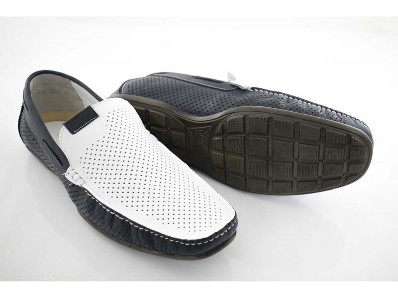Удобные и стильные мужские мокасины выполнены украинской запорожской фабрикой из натуральной кожи. Летняя мужская обувь в белом цвете с синими вставками.