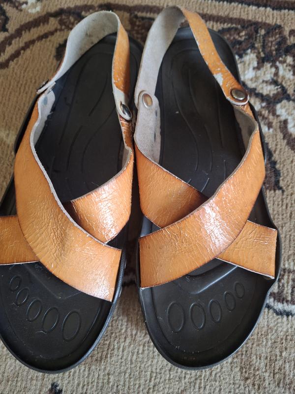 Легкі чоловічі сандалі рижого кольору,натуральна шкіра,28 устілка. Можна на широку ногу. На задній шлейці є потертості, трохи облізла краска.