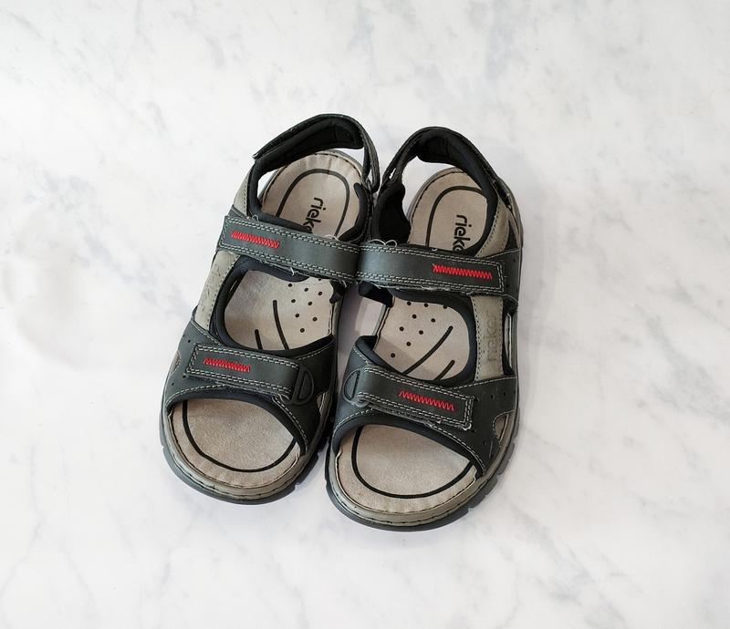 Мужские сандалии Rieker в очень красивом состоянии, стелька 29 см., размер 44 -45., замеры стельки на фото. Повседневные удобные, не тяжелые мужские босоножки, сандалии черного, серого цвета, украшенные красными швами из верхнего материала экокожи в красивом виде нубука. Внутренний материал и удобная стелька выполнены из синтетического материала. Две практичные застежки-липучки над супинатором и одна вокруг пятки позволяют индивидуально подстроиться под стопу. Особенно легкая и гибкая подошва изготовлена из пластика КС.