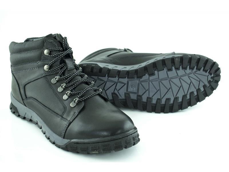 Тёплые мужские зимние ботинки украинского бренда. Зимняя обувь выполнена из жесткой натуральной кожи, утепленные шерстью, на шнуровке с противоскользящей прорезиненной подошвой, в черном цвете. Отличный вариант для холодной зимы.