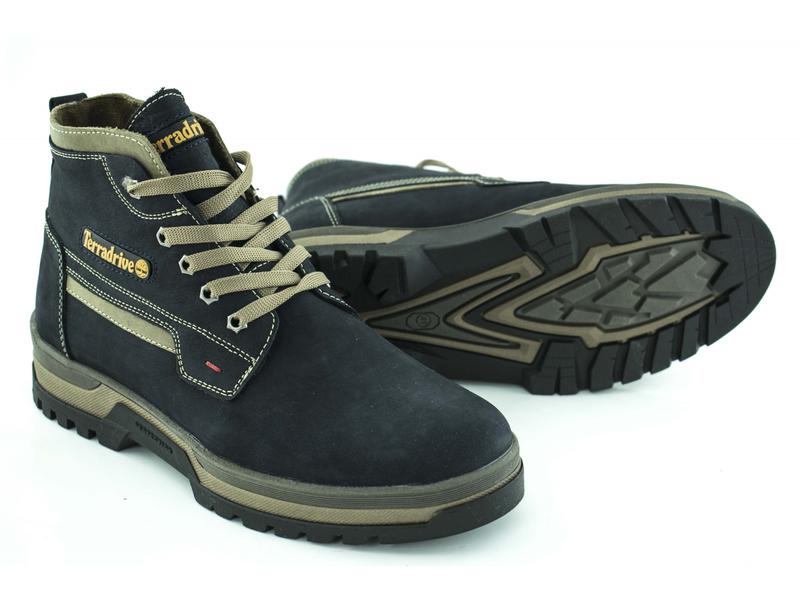 Тёплые мужские зимние ботинки украинского бренда. Зимняя обувь выполнена из мягкой натуральной кожи, утепленные шерстью, на шнуровке, в синем цвете. Отличный вариант для зимы