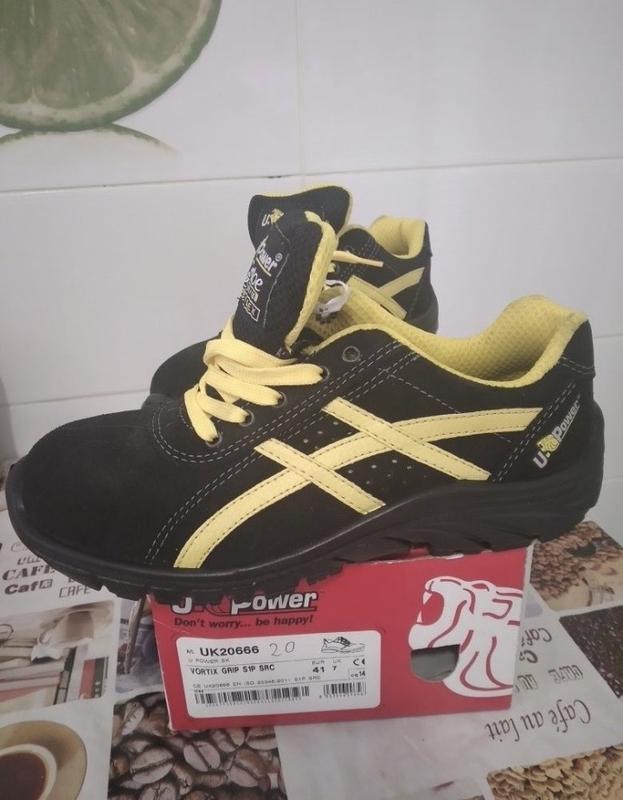 Захисне взуття. U Power Vortix Grip S1P призначена для максимальної безпеки для робітників з підвищеною небезпекою та складною слизькою місцевістю. Верх із перфорованої замшевої шкіри. Підошва з високою стійкістю до ковзання, з параметрами набагато вище, ніж у іншого взуття того ж діапазону, але така ж гнучка і легка. Висока повітропроникність забезпечує свободу пересування; устілка з поліаміду, анатомічна, м'яка, дихаюча, а також сухість ніг протягом дня. Розміри 40-41