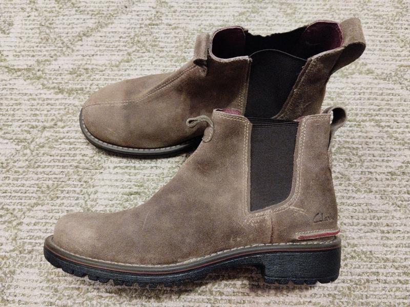 Замшевые челси Clarks. Стильные замшевые ботинки Clarks, искусственно потёртый вид, крепкая резиновая подошва, оригинал. Размер 8М, грубо говоря 41,5. Стелька длиной 26,5см по ровной её части. Новые.