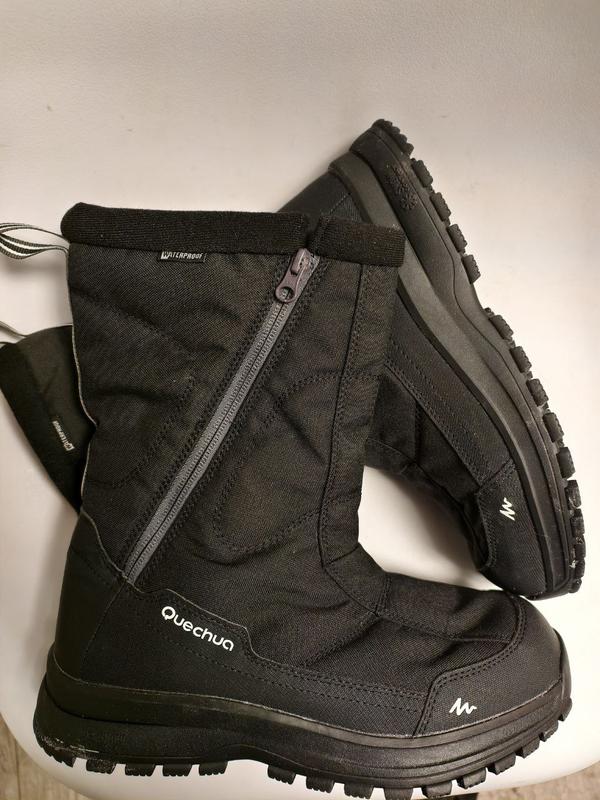 теплые водонепроницаемые зимние ботинки для пеших прогулок бренда Quechua от Decathlon. Они имеют боковую застежку-молнию для легкого надевания и снятия. Основные характеристики Водонепроницаемость: Оснащены дышащей водонепроницаемой мембраной, которая сохраняет ноги сухими. Тепло: Обеспечивают тепловой комфорт, с температурой комфорта около -13°C в статике и -22°C в движении для мужской модели SH100 U-Warm. Сцепление: Подошвы SNOWCONTACT обеспечивают максимальное сцепление и тягу на снегу благодаря специальному рисунку протектора с шипами глубиной 3-4 мм. Удобство: Высокий воротник помогает предотвратить попадание снега внутрь.