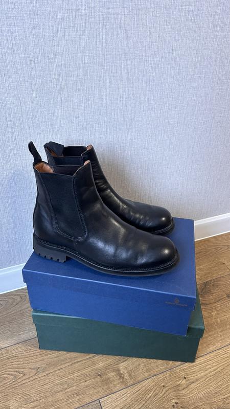 Британські чоботи челсі від Sanders&Sanders • Розмір: 42 (UK 8) • Стан: ідеальний (носились до 5 разів) • Матеріал: натуральна чорна шкіра • Конструкція: Goodyear Welted • Підошва: Commando з протектором • Оригінальна ціна: близько 300£ • Виробництво: Made in England Goodyear Welted конструкція забезпечує довговічність і можливість ремонту. Класичний силует челсі з еластичними бічними вставками. Міцна підошва Commando з глибоким протектором для надійного зчеплення. Преміальна британська якість від Sanders&Sanders - бренду з багаторічними традиціями виготовлення взуття.