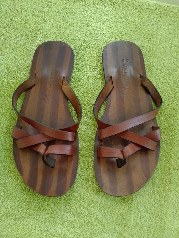 Продам шлёпанцы кожаные шлёпанцы бренда San Marina. состояние отличное,немного стёрты подошвы. размер 45. длина от края до края 29 см.