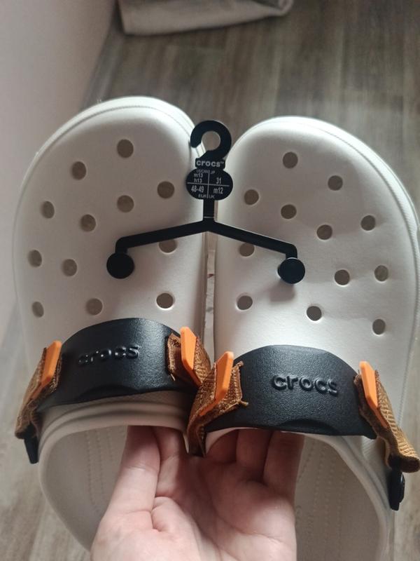 білі нові крокси, оригінал,, дуже легенькі. Чоловік замовив собі, але пролетів з розміром, завеликі.