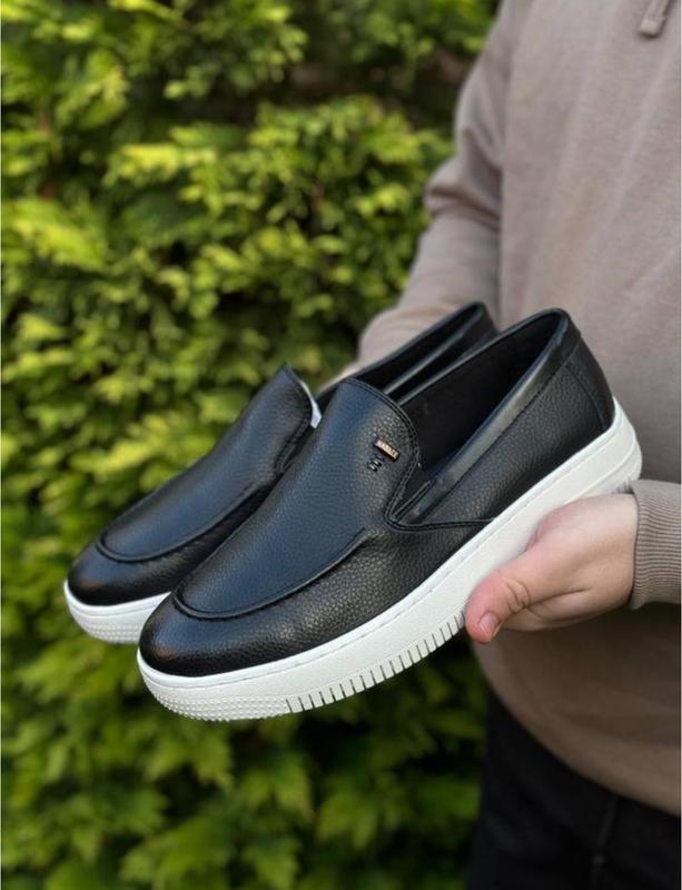 Стильні чоловічі сліпони чорні з білою підошвою. Матеріал: ▪️верх: еко-шкіра ▪️підошва: пвх Розміри: 40 41 42 43 44 45 40 - 26.0см 41 - 26.5см 42 - 27.0 см 43 - 27,5 см 44 -28 см 45 - 28.5см