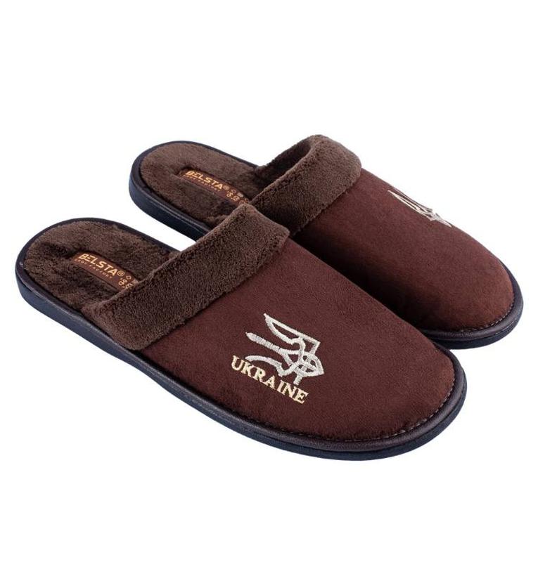 Мужские закрытые тапочки украинской фабрики БЕЛСТА из замша коричневого цвета с махровым отворотом, украшены патриотической вышивкой в виде Тризубца, на стельке из махры. Модель полномерная. Подошва сделана из полиуретана. Закрытые домашние тапочки из замши на махровой стельке — это идеальный выбор для холодных зимних вечеров. Они имеют мягкую махровую стельку, которая обеспечивает дополнительный комфорт и тепло. Верх тапочек выполнен из замши, что придает им элегантный и стильный вид. Замша также обеспечивает дополнительную теплоизоляцию, защищая ваши ноги от холода и влаги. Такие тапочки имеют закрытую конструкцию, что обеспечивает дополнительную защиту и комфорт для ваших ног. Подошва полиуретана обладает высокой износостойкостью, что позволяет ей выдерживать длительный период эксплуатации без значительной потери своих свойств; гибкая и мягкая, что позволяет обуви лучше адаптироваться к форме стопы и обеспечивает более комфортную посадку; удобная, что обеспечивает удобство при ходьбе, не создает дополнительной нагрузки на ступни, что помогает уменьшить усталость ног; обладает хорошей амортизацией, что помогает смягчить удары и снизить воздействие на суставы при ходьбе. Размер и длина по стельке: 41 - 27 см., 42- 27,6 см., 43 - 28,2 см., 44 - 28,8 см., 45 – 29,5 см.