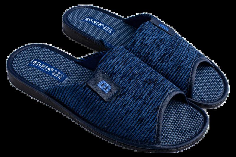 Мужские открытые тапочки украинской фабрики Белста из вельвета, украшенные логотипом фабрики, на стельке из текстиля. Подошва сделана из полиуретана.