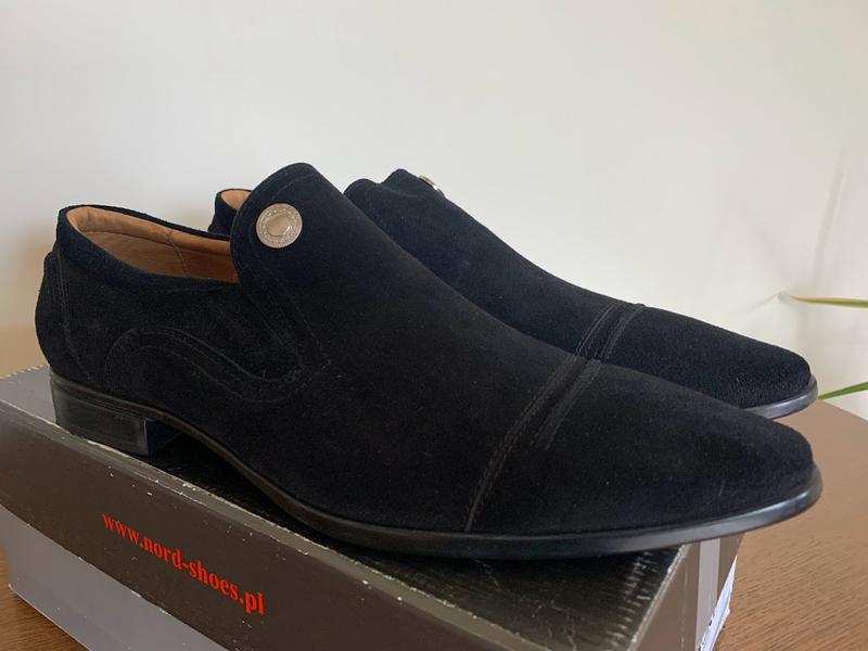 Туфлі Nord виготовлені з натурального замшу чорного кольору. Деталі: еластичні вставки, внутрішнє оздоблення з натуральної шкіри, гумова підошва з невеликим підбором. Заміри Довжина стельки 29/29.5 см ширина 10/10.5 см Країна бренду: Польща; Колір чорний; Верх взуття: натуральна замша; Підкладка: натуральна шкіра; Устілка: натуральна шкіра; Кріплення підошви: проклеювання;