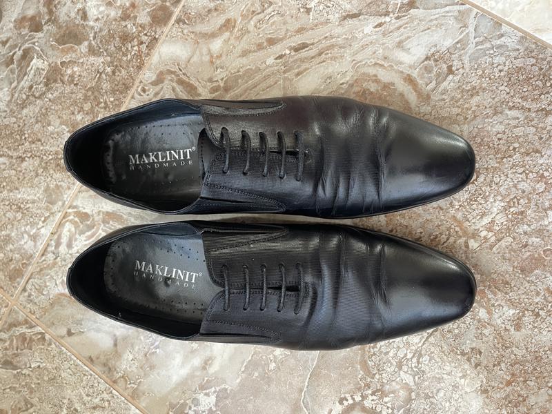 Современные кожаные туфли Maklinit очень легкие и мягкие, удобные. На полную и среднюю ногу.Полнота регулируется с помощью резиночек, которые очень красиво задекорированы с обеих сторон.Это дает Вам гарантию, что туфли будут не узкие и легко обуваться.Внутри подкладка полностью кожаная.Шнурочки тонкие,легантные, идеальной состояния (мышления можно не пользоваться).Носки идеальны, не потерто.Кожа не лакированная.Размер 43.Довжина по подошве-31см,а вообще на ножку длиной-27,5 см. Отправлю дополнительные фото.Стан хорош. Надевали на выпускной.