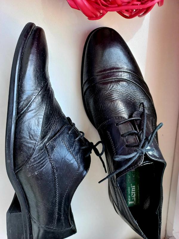 Чрезвычайно добротные и качественные туфли на шнуровке из натуральной кожи с интересными кожаными вставками на носах. Решта - на фото. Размер 41. Потолка 26,5 см. Кожа извне и внутри.