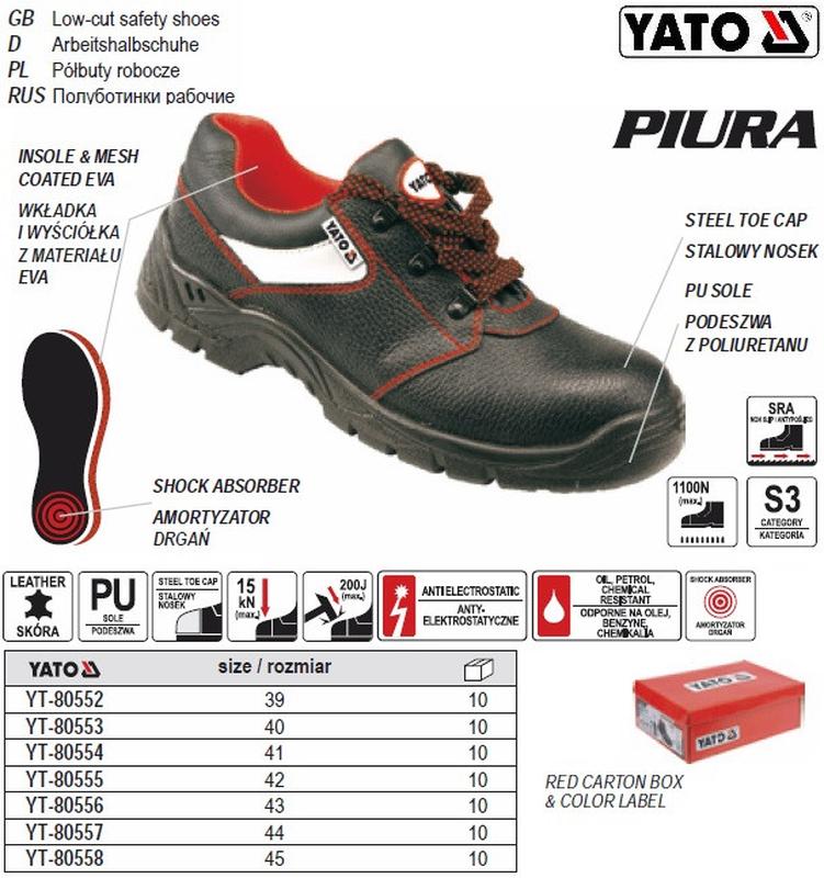 YATO-80557 - профессиональные туфли рабочие. Описание продукта: - изготовлены из кожи - шнуровка - подошва PU, устойчивая к маслам, электроизоляционная, противоскользящая - противоударный металлический элемент прочный к ударам с энергией 200 Дж и сдавливанию до 15 кН - защита подошвы от прокалывания до 1100 Н - категория защиты S3 - соответствуют требованиям нормы EN20345 - амортизационная стелька Применяются для защиты стопы и ноги от механических и электрических повреждений или вредного воздействия химических веществ, тепла, холода или влаги при строительных, транспортных, механических работах. Прочность, совершенство исполнения, отличные материалы, сталь высокого качества - технические особенности продукции YATO, чье предложение касается трех сфер: обслуживания, строительства и сада. Ручные и пневматические инструменты YATO с успехом используются специалистами во многих областях экономики, в интенсивных промышленных условиях и в сервисных центрах.