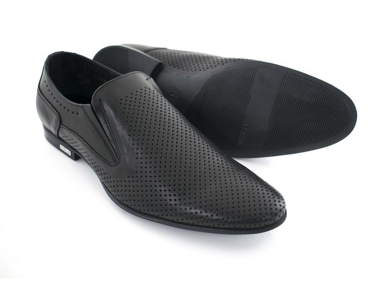 Стильные классические стильные мужские летние кожаные туфли запорожской обувной фабрики. Обувь выполнена в черном цвете со сквозной перфорацией, в классическом стиле, на резинках на подъеме.