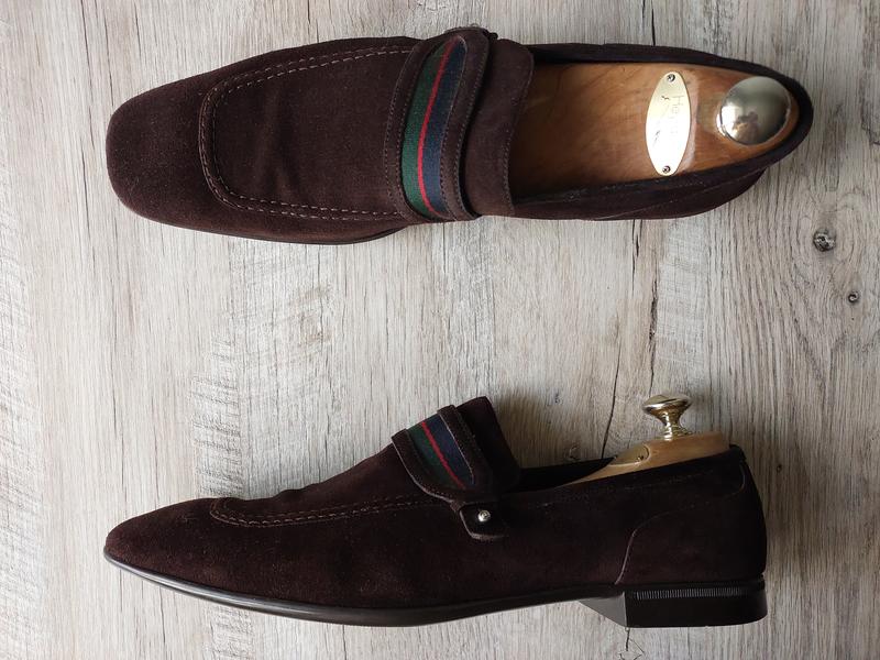 Замшеві лофери / туфлі від преміального бренду GUCCI Оригінал Модель: Gucci Brown Suede Web Slip On Loafers Стан чудовий, сліди використання косметичні. На носку лівого туфля присутня пляма більш темного кольору. Походження не знаю. Розмір вказано 10