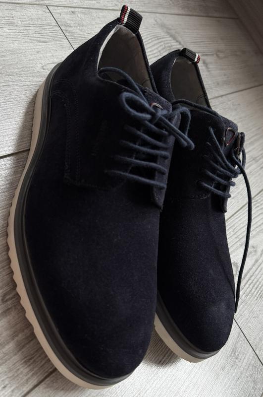 Шикарные кежуальные туфли от известного бренда, вытесненное лого на левой стороне, лого на язычке, отличная замша темно-синего цвета, очень легкие и удобные, подошва Extralight, отлично смотрятся на ноге Состояние новых без коробки Размер 42 27 см