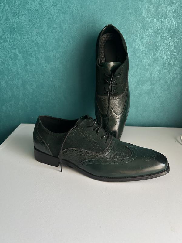 Темно зелені чоловічі туфлі з перфорацією Устліка 29 см Ширина устілки 9 см Стан: нові Матеріал : еко шкіра/замша Виглядають шикарно На нозі немає Відправка 1-3 робочих і дні Доставка нп/укр/міст/розетка Безпечна оплата / оплата на карту