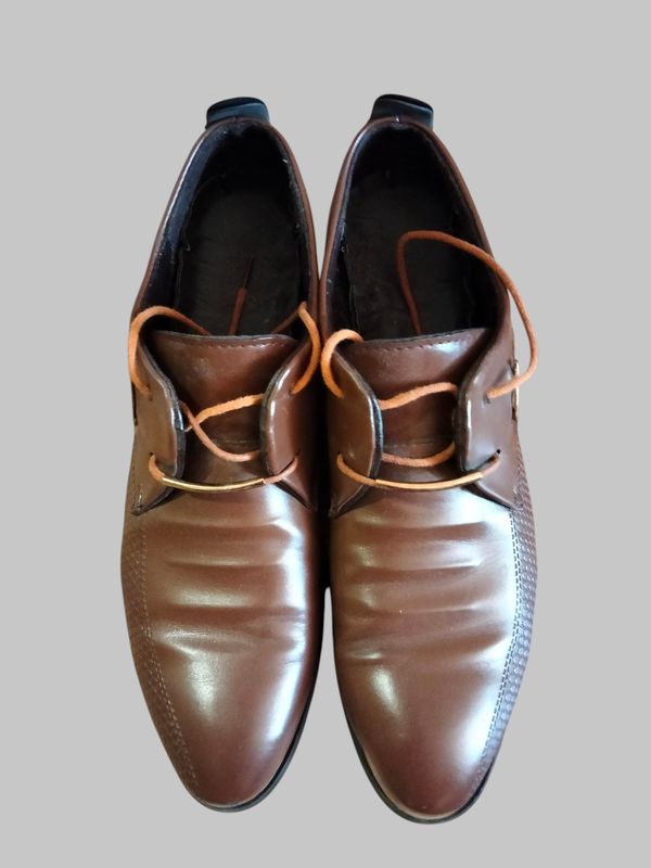 Мужские коричневые стильные туфли из натуральной кожи В очень хорошем состоянии Все как на фото Недостатки: слегка счесаные кольца, видимо на фото. Также на одном из каблуков дирочка,теж виден на фото.Также потолки слегка расклеиваются Очень стильные и красивые! Размер: длина по потолке: 28,5 см Ширина по потолке: 9 см Длина по подушке: 29,5 см По ступне: 27 см подходит Носит с удовольствием! Благодарю за ваш выбор!