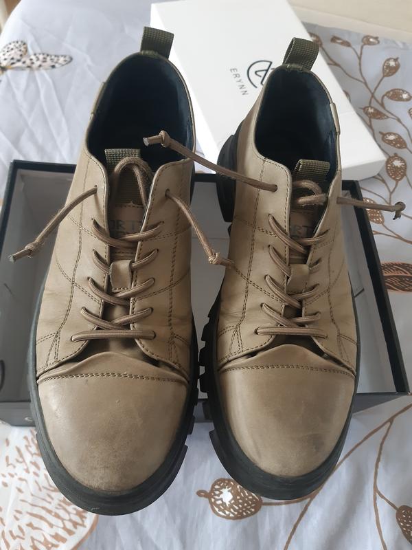 Мало ношені,колір хаки,телефон сліпить, насправді більше зелен , на 41 розмір.Туфоі з натуральної шкіри нубук.