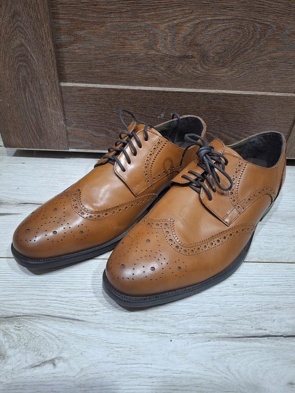 Туфли Jacamo, размер 45. Классическая пара в теплой карамельной гамме, выполненная в стиле брогов с деликатной перфорацией. Форму держат отлично: носок слегка удлиненный, силуэт аккуратный, универсальный - как для smart-casual, так и для более формального образа. Верх из гладкой искусственной кожи приятно блестит, подошва контрастно темная и выносливая, шнуровка стандартная. Хороший вариант для офиса, событий или стильных повседневных образов, если хочется немного британской сдержанности с характером.
