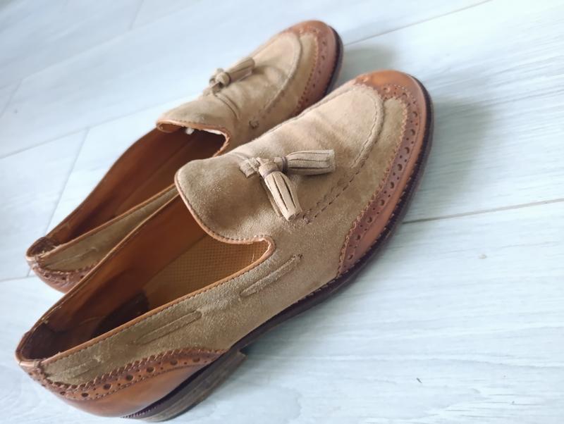 Бренд: ZARA (логотип четко виден на подошве и стельке). Материал: Натуральная замша бежевого или песочного цвета. Тип подошвы: Кожаная подошва с резиновой накладкой на каблуке для лучшего сцепления. Размер: На подошве указан размер 42. Эти туфли являются классическим вариантом обуви в стиле smart-casual, хорошо сочетающимся как с джинсами, так и с неформальными костюмами. Подобные модели также можно найти у таких брендов, как Massimo Dutti, Lardini и Alden.