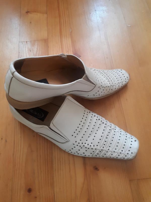Туфли молочного цвета, кожаные сверху и внутри. В подъёме по бокам вставлены резинки. Стелька внутри 29 см, снаружи 31см. Из дефектов- немного стёрты носки и каблук. В цене учтено!