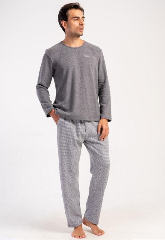 Качественный, мягкий пижамный комплект для дома и сна – однотонный лонгслив с круглым вырезом; штаны свободного прямого кроя в мелкую клетку, с карманами. Комплект из турецкого двойного трикотажа (48% полиэстер, 48% хлопок, 4% эластан). Мягкая, приятная к телу ткань хорошо пропускает воздух, не вызывает раздражения, впитывает влагу. Отправка товара в день заказа.