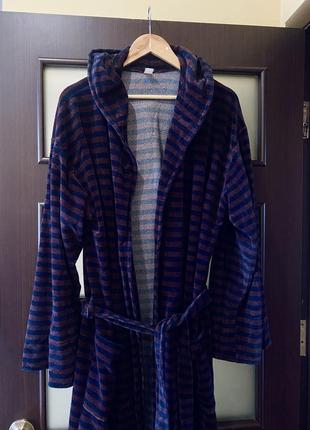 Мужской халат, в хорошем состоянии. Эффектов нет, но с одной стороны отсутствует лямка для ремня (фабричный нюанс). Был в пользовании мало. Размер M-L.
