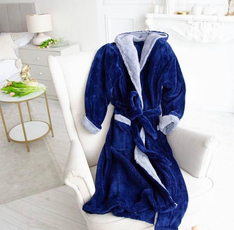 Чоловічий махровий халат з капюшоном Розміри: L, XL, 2XL, 3XL Розміри: 46-48.48-50.50-52.52-54 Кольори: сірий, коричневий, синій, хакі, синій з сірий Можна замовити оптом: ростовка з 4-ох розмірів