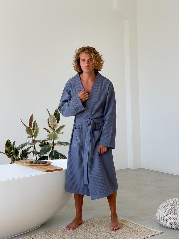 Мужской халат на запах с карманами натуральный вафельный для дома халат для бани сауны цве...