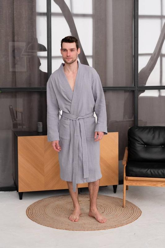 Мужской халат из фактурного муслина DUNA обеспечит комфорт и уют дома. Ткань имеет фактурное уплотнение нитей, создающих рисунок в виде пересечения нитей. Ткань идет из двух слоев. Внутренняя сторона очень мягкая и нежная, приятная телу. Внешняя сторона фактурная немного толще, напоминающая льняную фактуру. Ткань хорошо драпируется, ложится красивыми легкими складками, не просвечивается. Завязка на поясе, по бокам два накладных кармана. Тканина: 100% бавовна Плотность: 140 г/м2 Размеры: m, l, xl, 2xl Цвет: хаки Арт.: M61 Есть парные мужские и женские разные цвета