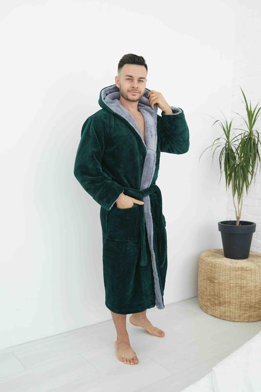 Качественный теплый махровый мужской халат с капюшоном. халат серый/синий/зеленый 48-56