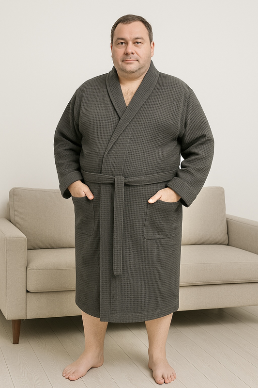 CZ_ 924 Для всех, кто ценит комфорт и стиль вне зависимости от пола, наш унисекс халат станет вашим новым фаворитом. Он доступен в размерах 2XL, 3XL и 4XL, что обеспечивает идеальную посадку даже для тех, кто ищет что-то большее. Безумный воротник придает изысканный вид, при этом сохраняя мягкость и удобство. Регулируемые рукава - легко подойдут под любой рост, ведь их можно подворачивать до нужной длины. Темно-серый цвет подчеркивает универсальность и элегантность халата. Идеально подойдет как мужчинам, так и женщинам. Изготовленный из 100% хлопка вафельной ткани, он дарит ощущение натуральной легкости и дышит. Это означает, что халат не только отлично держит тепло, но и позволяет коже дышать, не парит. Идеальный вариант для домашнего уюта или спа-процедур! С таким халатом каждый момент дома превращается в маленький праздник комфорта и стиля. • Материал: 100% хлопок, Турция • Плотность: 220 г/м2 • Размеры: 2XL, 3XL, 4XL • Изготовлено в Украине • Доставка: Нова пошта, Укрпошта 📍На фото размер 2ХЛ на мужчине рост 1.8 м и на женщине рост 1.64 м 🎁Есть возможность добавить подарочную упаковку. ....................... ❗️ Ткань не декатированная, после стирки дает усадку 5-6% (8-10 см). При первой примерке халат должен быть свободным, он не должен быть по фигуре и идеально сидеть. ✅Правила ухода просты: 1. Стирать в холодной воде не более 40 градусов (рекомендуется 30 градусов), на малых оборотах 400. Не использовать отбеливатели. 2. Естественная сушка. Не сушить в барабане. Рекомендуется немного растянуть изделие при сушке 3. Гладить при высоких температурах до 200°С (режим хлопок) с паром. После стирки вафельные клетки собираются, но после высыхания и глажки они расходятся. Вся информация по уходу за изделием указана на бирке.