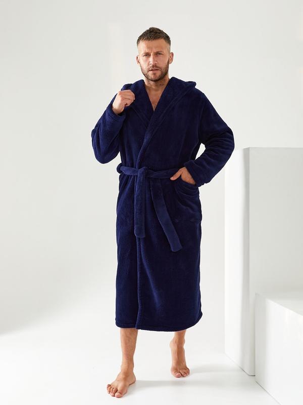 Мужской махровый халат с капюшоном длинный темно синий l размер 48