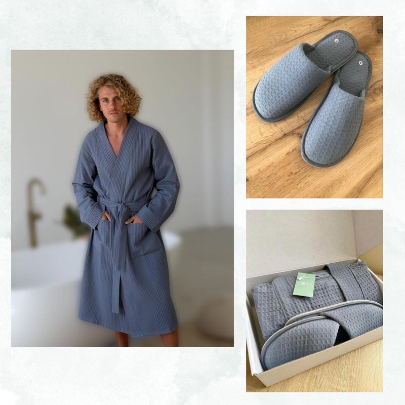 Набор мужской халат и тапочки банные размер M, подарочный наборы халатов стильные вафельные Маренго Синий COSY Разные цвета и размеры Подарочный набор для мужчины: халат + тапочки в элегантной подарочной коробке Элегантный мужской халат «Маренго» - Материал: Высококачественная вафельная ткань из 100% хлопка (производство Турция). Плотность ткани - 220 г/м². - Преимущества: - Натуральный материал позволяет коже «дышать» и не вызывает дискомфорта. - Плечи слегка приспущены, что добавляет свободы движения и современного вида. - Цвет «маренго» - стильный оттенок темно-серого, который подчеркивает элегантность. - Особенности ухода: 1. Стирать при температуре до 40°С на деликатном режиме (отжим на малых оборотах - 400 об/мин). 2. Использовать естественную сушку с легким растягиванием изделия. 3. Гладить на режиме «хлопок» до 200°С с паром. 4. Внимание: после стирки ткань может дать усадку 5-6%, но это учтено при пошиве. Тапочки из вафельной ткани - Размеры: - 44 размер: подходит на стопу длиной 28 см (подошва 30 см). - 47 размер: подходит на стопу длиной 29-30 см (подошва 32 см). - Подошва: Изготовлена из материала EVA: - Легкая, эластичная и водонепроницаемая. - Обеспечивает отличную теплоизоляцию и надежность в использовании. - Рекомендации по уходу: 1. Ручная стирка без отжимания. 2. Сушить на ровной поверхности, давая воде стечь естественным путем. Преимущества подарочного набора: - Стильный дизайн и практичность. - Натуральные материалы, гарантирующие комфорт и долговечность. - Универсальный подарок для мужчин, который станет незаменимым как дома, так и в путешествиях. Этот набор - идеальное сочетание комфорта, стиля и заботы о здоровье! Внимание! Цветовые оттенки на фотографиях могут отличаться в зависимости от настройки монитора