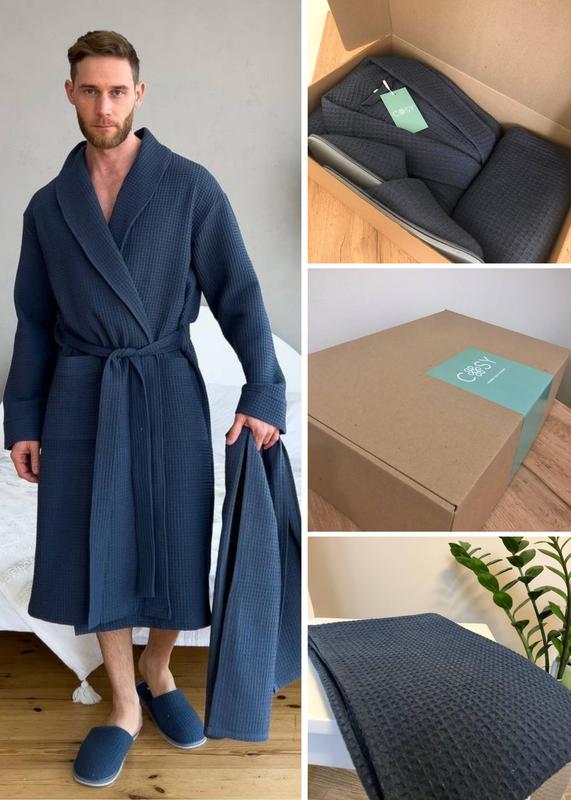 CZ_Set9202 🎁Есть много других подарочных наборов для мужчин и женщин. Подберем на любой вкус и кошелек🤗 📌В состав набора входит: - халат вафельный - полотенце вафельное 70*140 - тапочки из вафельной ткани Элегантный мужской халат Сапфир с шалевым воротником выполнен из высококачественной вафельной ткани. Изготовленный из натурального 100% хлопка, этот халат обеспечит комфортный отдых, что так необходим после насыщенного дня. Простой и удобный крой позволяет чувствовать себя максимально комфортно. Турецкое качество ткани гарантирует долговечность и износостойкость изделия. • Цвет: темно-синий • Материал: 100% хлопок, Турция • Плотность: 220 г/м2 • Размеры: S, M, L, XL, XXL Тапочки из вафельной ткани: Прочная подошва EVA - легкая, имеет малый вес. Не пропускает воду, не растрескивается со временем. Материал теплоизоляционный, эластичный, гигиеничный, надежный. • Тапочки 42 на размер 40-41 (на стопу 27 см), длина подошвы 29 см • Тапочки 44 на размер 42-43 (на стопу 28 см), длина подошвы 30 см • Тапочки 47 на размер 44-45 (на стопу 29-30 см), длина подошвы 32 см Рекомендации по уходу: ❗️ Ткань не декатированная, после стирки дает усадку 5-6% (6-7 см). При первой примерке халат должен быть свободным, он не должен быть по фигуре и идеально сидеть. ✅Правила ухода просты: 1. Стирать в холодной воде не более 40 градусов (рекомендуется 30 градусов), на малых оборотах 400. Не использовать отбеливатели. 2. Естественная сушка. Не сушить в барабане. Рекомендуется немного растянуть изделие при сушке 3. Гладить при высоких температурах до 200°С (режим хлопок) с паром. После стирки вафельные клетки собираются, но после высыхания и глажки они расходятся. Вся информация по уходу за изделием указана на бирке. Капці: 1. Рекомендовано использовать только ручную стирку. 2. Тапочки лучше не отжимать, а дать воде стечь и просушить их затем на ровной поверхности.