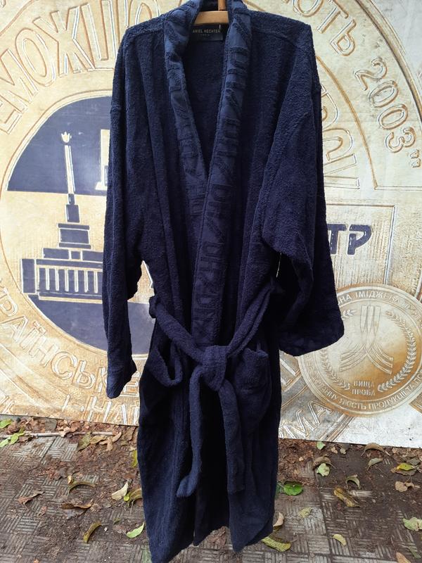 Халат держит вас в тепле и уюте, высокий комфорт при носке. По полам и по низу рукава выбитое название бренда.Фото 1. Цвет благородный темно-синий, как на фото 5. 2 кармана. Внутренние завязки на поясе. Пояс на шлевках. Склад тканини-бавовна 100 %. То, что на фото смотрится, как пятна, то засвети камеры.Цвет идеально,очень насыщенный Состояние очень красиво.Нема никаких нюансов.Куповали в Германии. Довжина халата 126 см. ПОГ 68 см.