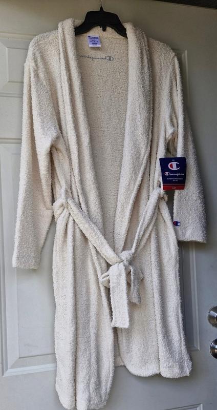 Махровый халат Champion. Размер M/L. Модель унисекс. Цвет молочный. Очень мягкий и приятный к телу. Совершенно новый, с биркой, привезенный из штатов. Оригинальная качественная вещь. На спине вышитое лого бренда, под пояс. Цена в интернете стартует от 50$.