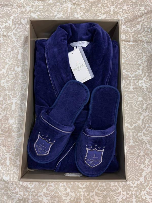 Халат махровий чоловічий з капцями Maison D’or ✨пошитий зі 100% бавовни. Махрова тканина цього халату виготовлена зі 100% бавовни і є полірованою махровою тканиною або часто її називають велюр. Розміри:S M L Xl Ціна:3300 грн