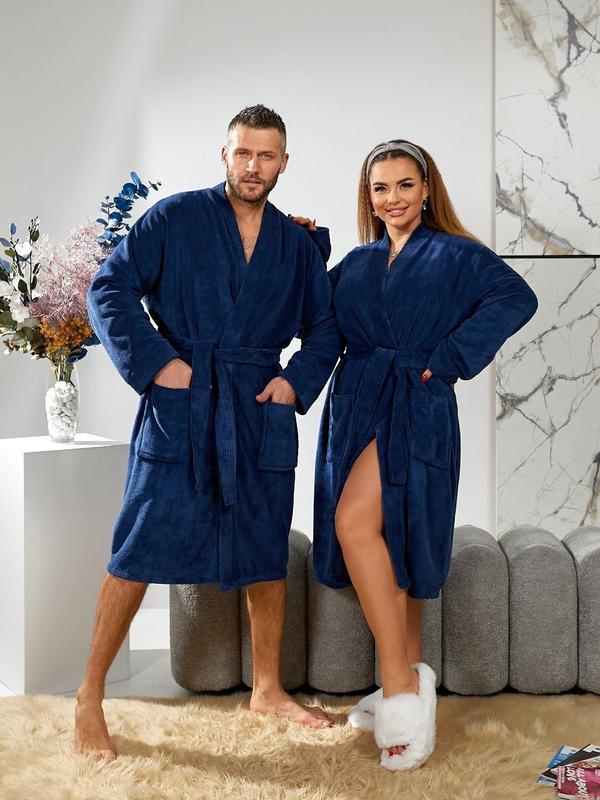 ✨Халат унисекс ✨Модель №802-1012 ✨Размер:42-48. 48-52 .52-56 ✨Ткань:микрофибра(отлично сохраняет тепло, быстро впитывает влагу, преимущественно легкая,идеальная для использования после душа или ванны) ✨Цвет:черный, мокко,синий ✨ Халат имеет классический крой с длинными рукавами,глубоким запахом и поясом для регулировки посадки по фигуре. Есть два накладных кармана для удобства
