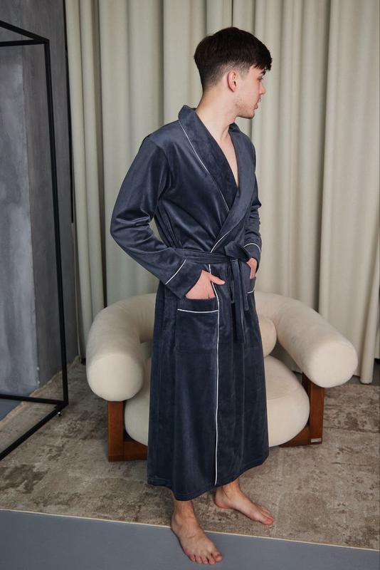 Мужской велюровый халат. Изготовлен из качественной ткани: плотный Турецкий велюр на хлопковой основе. Завязывается на запах и имеет два полноценных кармана. К каждому мужскому халату можно подобрать в пару женский. Прекрасная идея для подарка к любому празднику 🫶 Внутренняя и внешняя завязка Синий, черный, серый, шоколад,графит, капучино Производство Украина М Л ХЛ ХХЛ 3ХЛ является размерная таблица Ширина халата на уровне шлевки, на запах минус минимум 20см