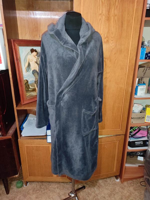 Халат мужской размер 48- 50, ткань легкая и приятная ВЕЛСОФТ, серого цвета, р. наш 48-50, есть капюшон. Первое и второе фото без успышки, другие засветлены, поэтому первые два фото натуральный цвет.