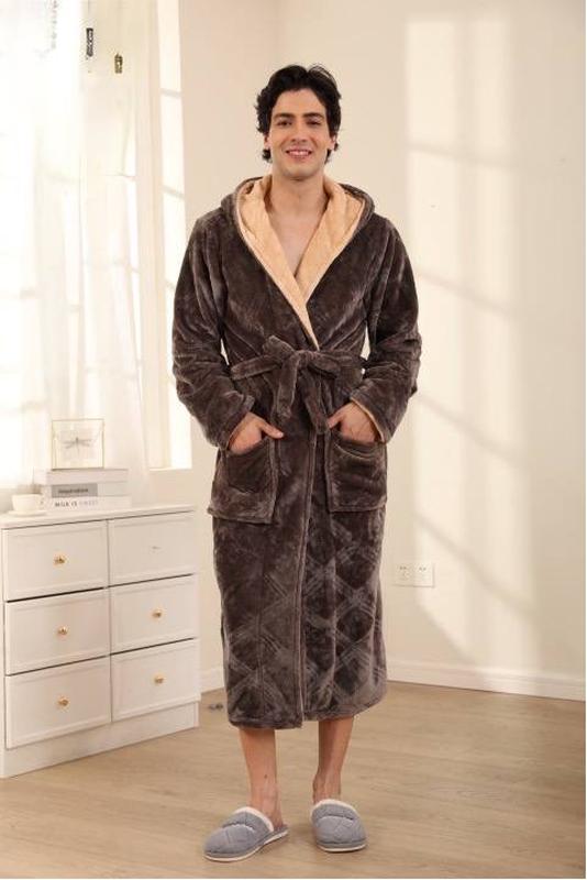 Чоловічий велюровий халат виконаний із плюшевого велюру на бавовняній основі. Халат чоловічий зручний, дуже м'який на дотик, не викликає роздратування, не псується при пранні і легко гладиться. Халат з капюшоном на запах, має дві кишеньки, довгий рукав, у комплекті пояс. Велюровий халат може стати приємним подарунком для чоловіка. Це чудова незамінна річ для дому чи відпочинку. Розміри 52.54.56.58.60.62
